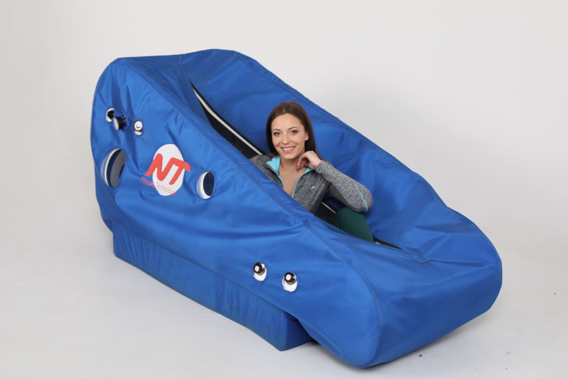Nasza komora typu siedząco – leżącego z unikalną konstrukcją kątową jest doskonałym wyborem dla osób, które nie mogą wejść do komory górnym wejściem lub po prostu chcą elastyczności w przechodzeniu od siedzenia prosto do leżenia na plecach. Użytkownicy wchodzą do środka od przodu komory, która jest zamykana na zamek błyskawiczny w kierunku stóp i otwiera się na środku, aby umożliwić łatwe wejście.