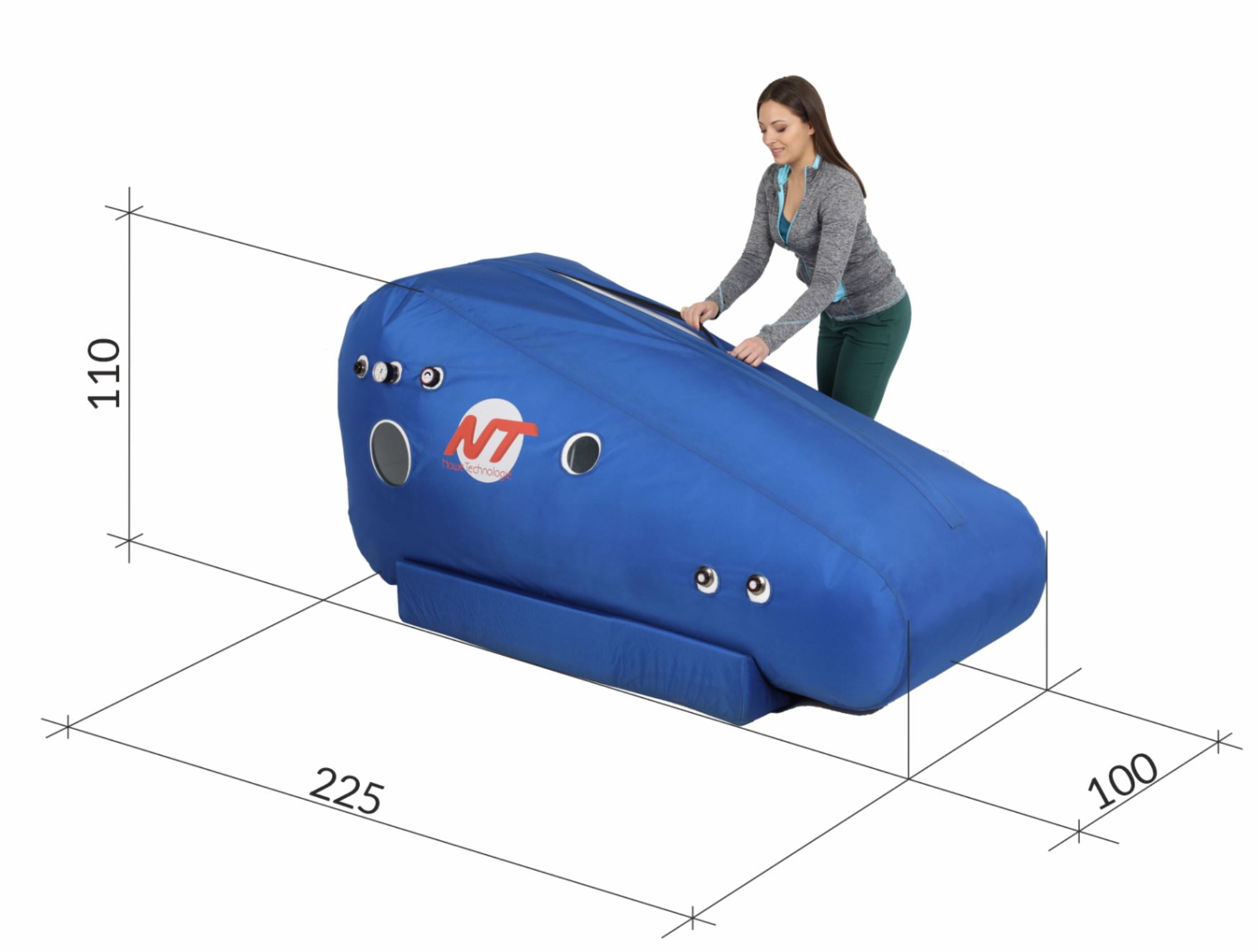 Dzięki długości 225 cm oraz otworowi na zamek błyskawiczny, osoby o każdym rozmiarze mogą wygodnie rozprostować nogi w tej komorze. Może ona dostarczać sprężony tlen o ciśnieniu 1,3 ATA (30 KPA). Ta komora hiperbaryczna oferuje ulepszony generator tlenu 10 l/min produkujący 95% do 97% czystego tlenu dla najbardziej efektywnych sesji tlenowych.  Nasz system został zbudowany z myślą o wielu funkcjach bezpieczeństwa. Na przykład, przycisk awaryjnego obniżania ciśnienia jest dostępny, aby przyspieszyć opuszczenie komory w sytuacjach losowych, a podwójne zawory upustowe zapewniają wylot nadmiaru powietrza u podnóża komory.
