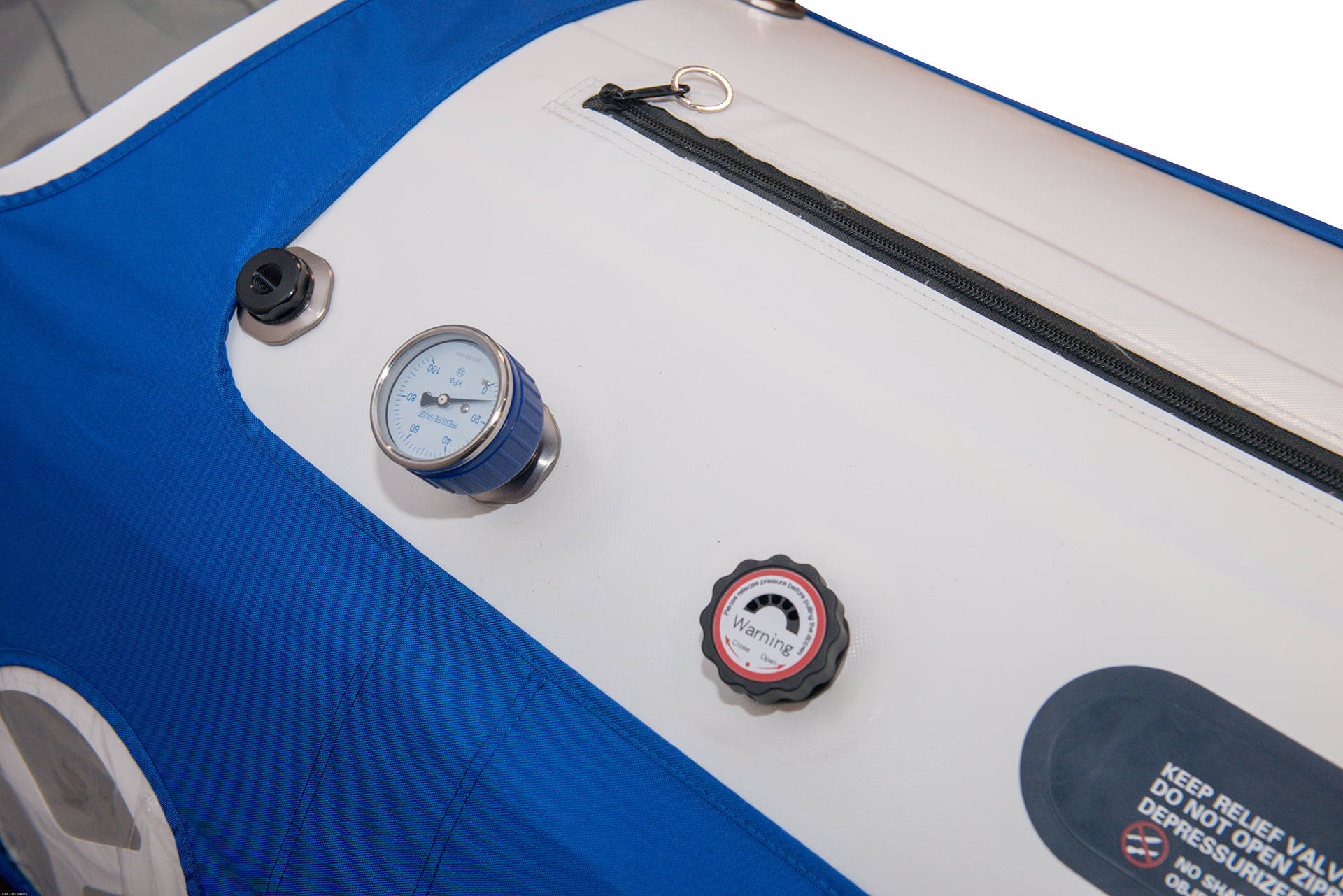 - Dostarcza bezpieczne i efektywne sesje tlenowe przy ciśnieniu 1,3 ATA . Wewnętrzny manometr jest wyposażony w taki sposób, aby użytkownik mógł obserwować ciśnienie wewnątrz komory. Wszystkie nasze urządzenia posiadają zarówno wewnętrzny jak i zewnętrzny manometr